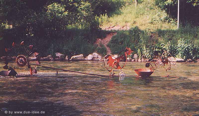 Ziel dieses Projektes war es zum einen, die Bewegung des Flusses in den Bewegungsablauf der Hühner mit einzubeziehen. Zum anderen wecken diese Pickenden Hühner beim Betrachter auch Erinnerungen an die eigene Kindheit nur mit dem Unterschied, dass sich hier die Hühner nicht mit der eigenen Hand bewegen lassen, sondern durch den Wasserstrom, dem Strom der Zeit.
