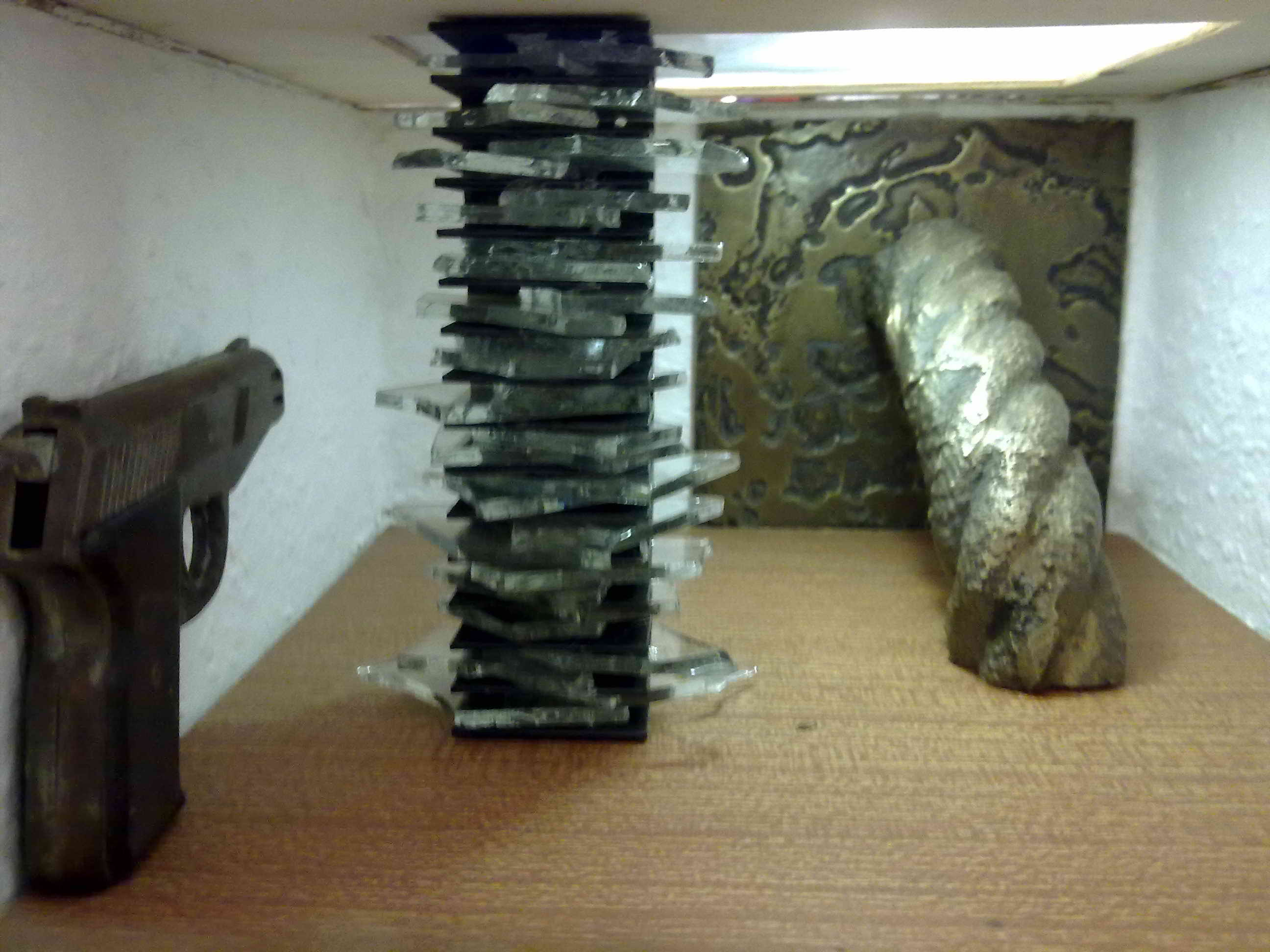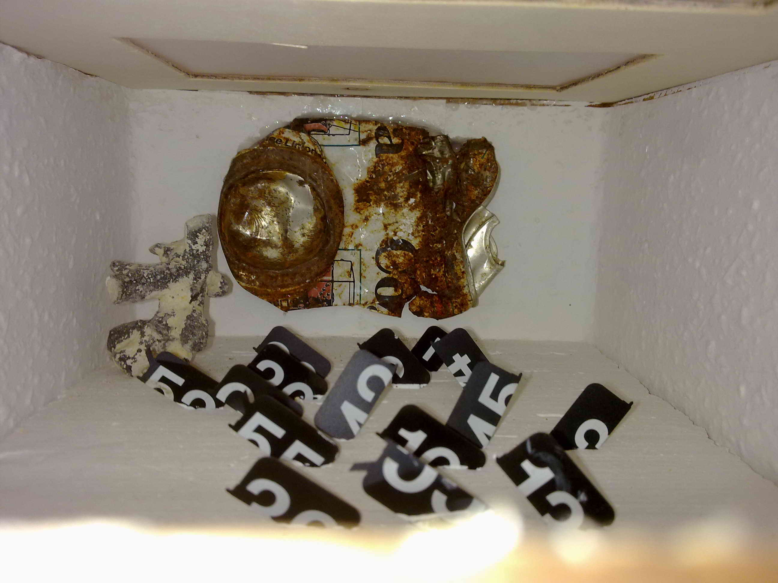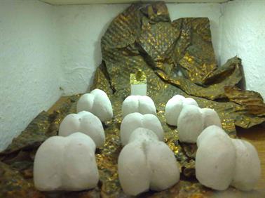 Zuerst wurden die Objekte maßstabsgetreu in Wachs modelliert. Auch hier wird bereits die Oberflächenstrukturierung durchgeführt. Diese bleibt durch den Guss erhalten. Danach wurden Einlass- und Gusskanäle aus Wachs angebracht. Diese Wachsformen wurden nun in Schamott eingebettet. Anschließend wurde das Wachs ausgeschmolzen. Die Gussform war nun bereit für den Metallguss.
