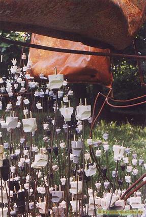 Alle Metallteile der Skulptur stammen aus gerade solchen, nicht mehr existenten Industriebetrieben und sollten diese auch symbolisieren. Die angebrachten Goldmosaiken, auch in ihren Unterschiedlichkeiten, verweisen auf Wohlstand