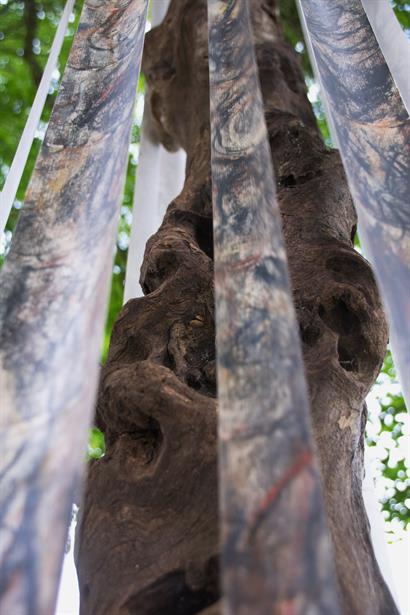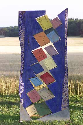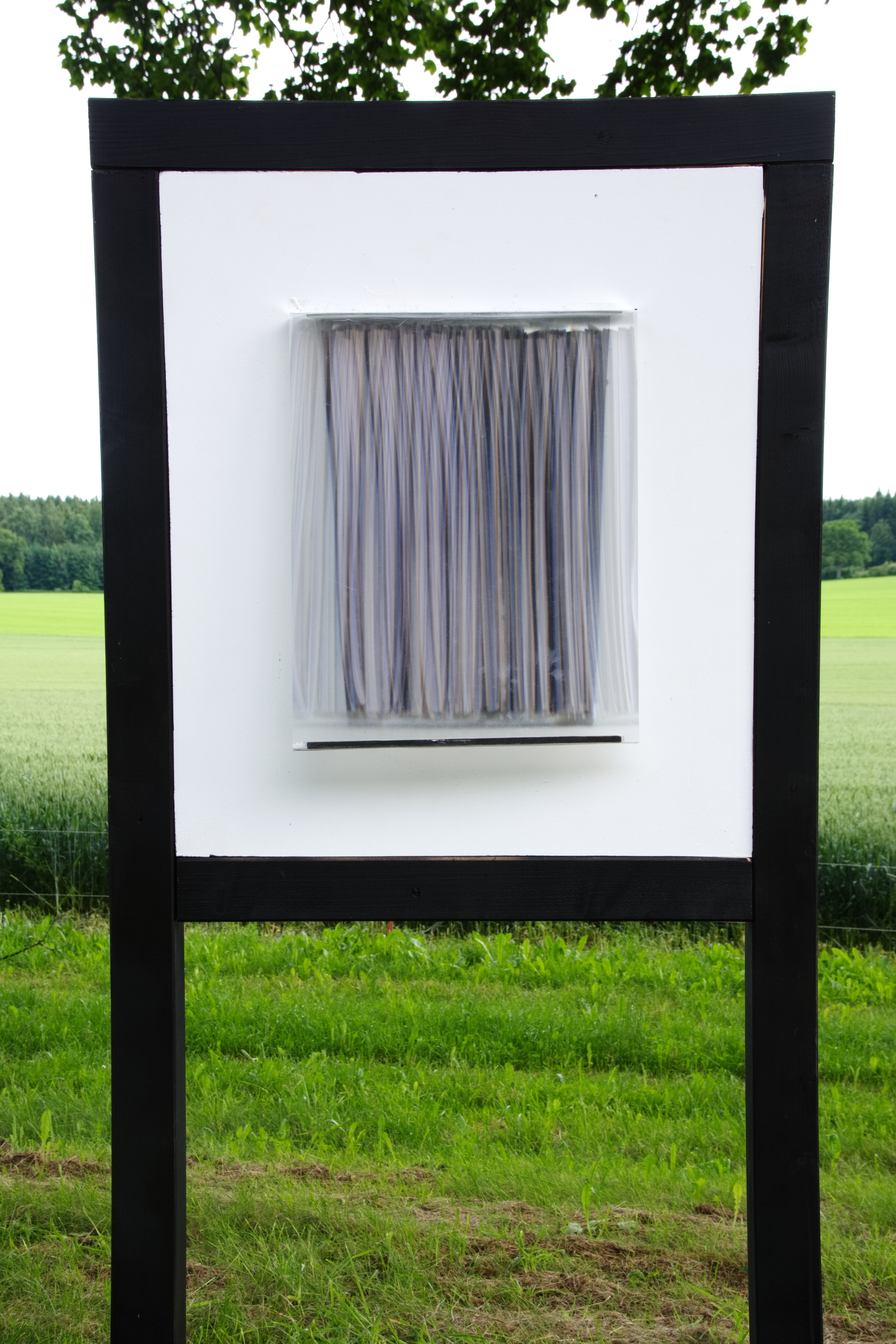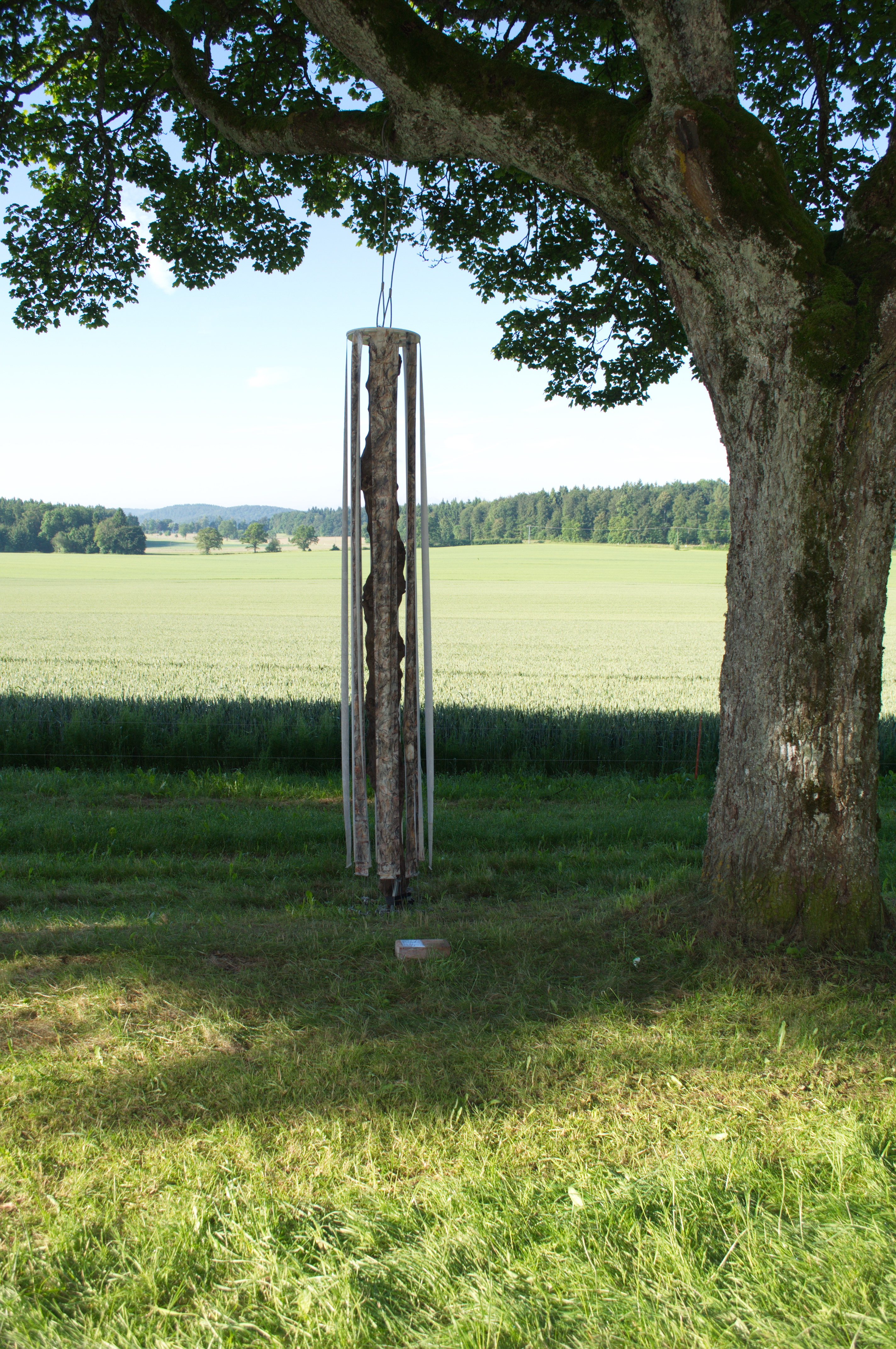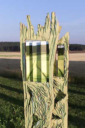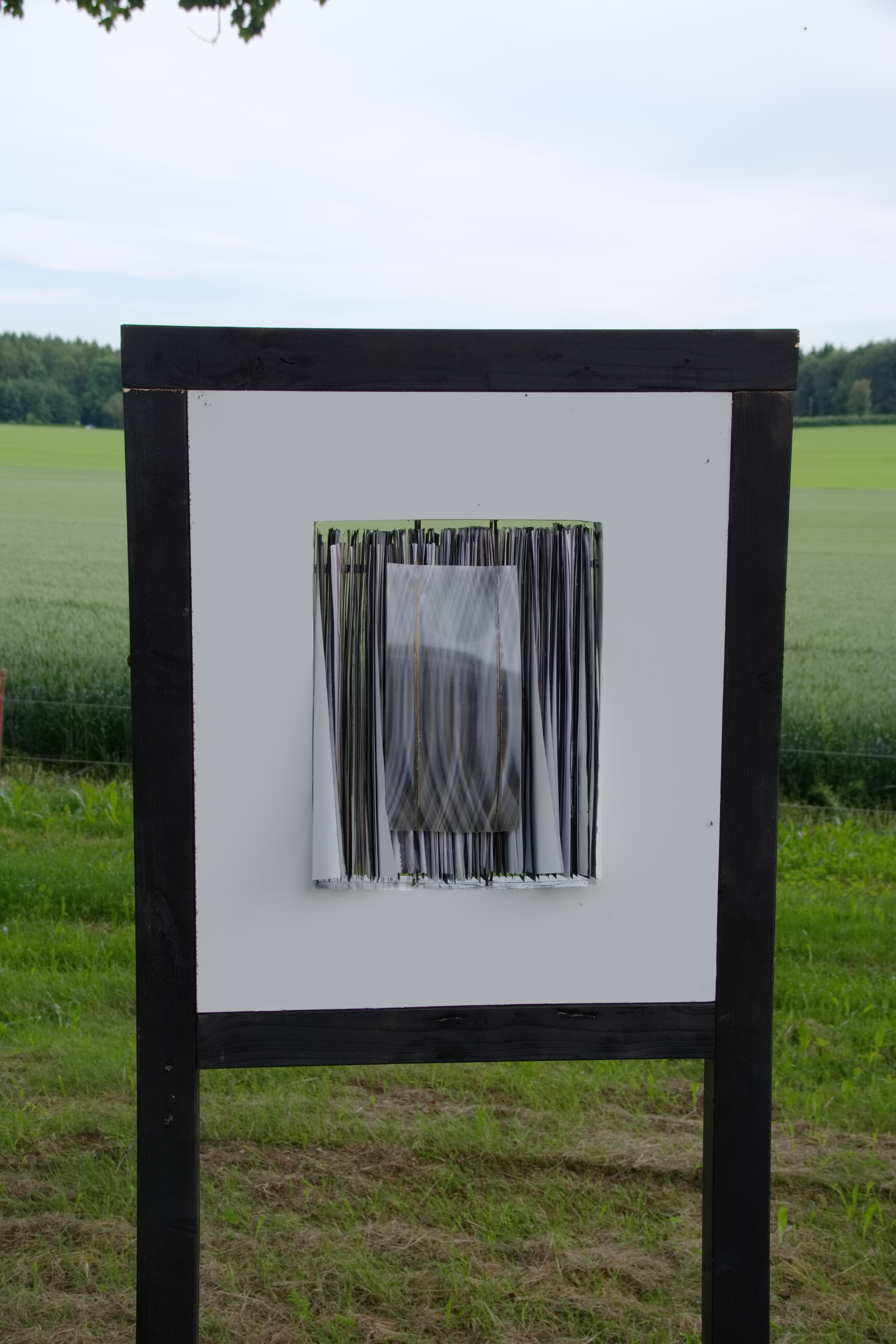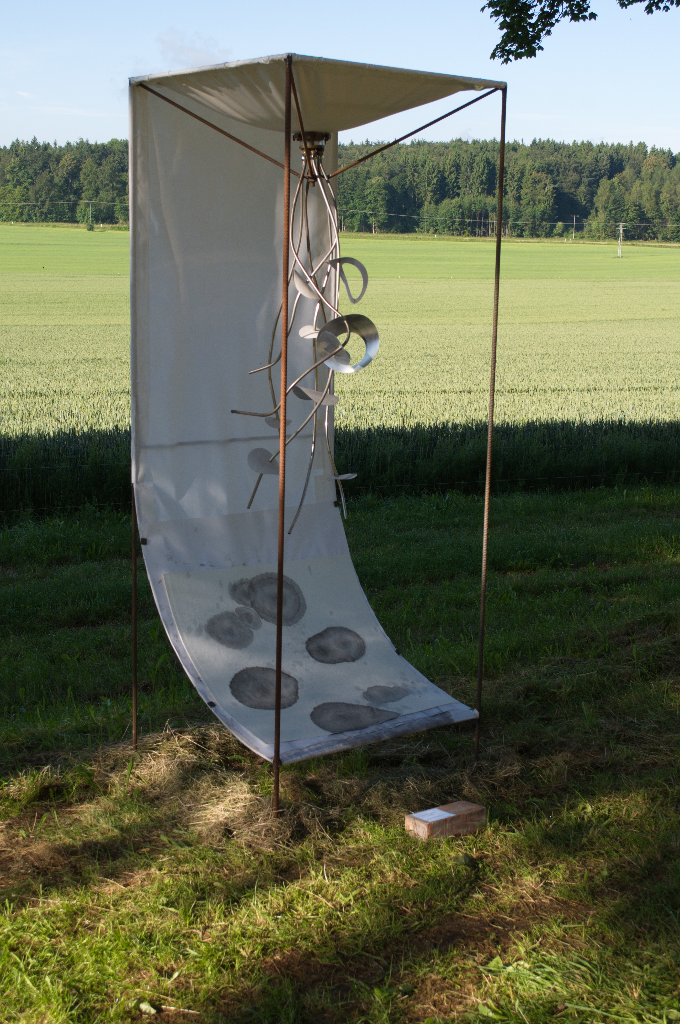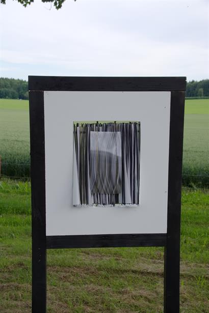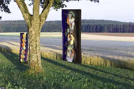 Der Holzdruck begrenzt auf zwei Dimensionen. Wir haben hier versucht, dem Holzdruck eine weitere Dimension hinzuzufügen. Der Holzdruck wird durch den Druckstock zum Objekt, wird frei durch die Bewegung im Wind durch sein Abbild auf Leinwand. Die Räumlichkeit von Landschaft, Natur, Wind und Wetter, von der Skulptur zum Druck, all dieses haben wir versucht, in unserm Ausstellungsbeitrag umzusetzen. Der Charakter der Druckfahnen verstärkt sich durch die freie Aufhängung zwischen den Bäumen und der Bewegung im Wind. Der Betrachter kann diese Druckfahnen oder Stelen entlanggehen und sich inmitten dieser Farben bewegen, sich davon lösen oder darüber hinweg sehen. Er kann in seiner Betrachtungsweise Farben, Kontraste, Flächen und Formen miteinander kombinieren auch unter Einbeziehung der Landschaft. Um dieses zu ermöglichen wurden die Drucke mit verschiedenen Druckstöcken gestaltet. Wichtig für uns war die Möglichkeit der Kombination, wie sie nun auch der Betrachter hat. Die Druckstöcke sind hier statisch gesehen vergleichbar mit den Alleenbäume, die Druckfahnen hingegen stellen dazu den freien Charakter von Bewegung und Leichtigkeit (wie vom Wind umspielte Blätter) dar. Die Farbflächen erscheinen immer wieder anders, je nach Lichtverhältnissen, Bewegung und Standort des Betrachters. Die Farben ändern sich und passen sich der Umgebung an. Die Farben und Formen beginnen sich im Umfeld zu verlieren oder zu vertiefen. Es entsteht eine Betrachtungsweise von innen nach außen und umgekehrt.